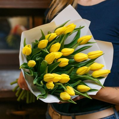 Желтые тюльпаны символизируют радость, счастье и весну. А белая упаковка добавит особой изысканности и элегантности вашему букету. Такой подарок точно