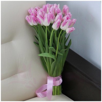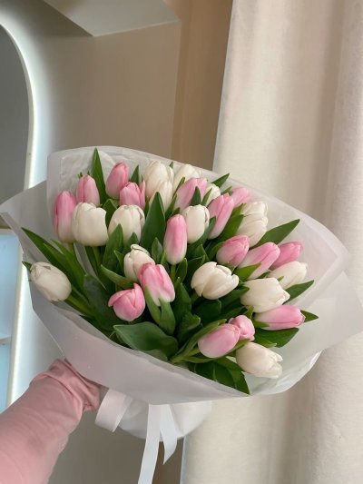 Тюльпаны - это символ любви и нежности, поэтому такой букет отлично подойдет для проявления ваших чувств к близкому человеку. Бело-розовая гамма прида
