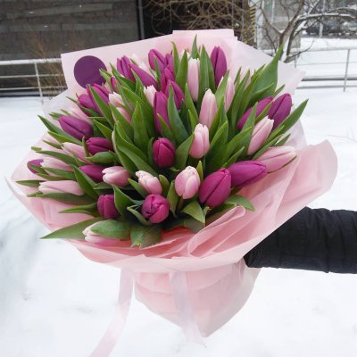 Мы можем предложить вам букет из 51 тюльпана, состоящий из белых и фиолетовых цветов. Белые тюльпаны символизируют чистоту, невинность и радость, а фи