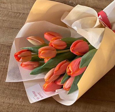 Букет из 15 оранжевых тюльпанов в стильной конверте кофейного цвета - идеальный подарок на 8 марта! Яркий и солнечный цвет цветов подарит тепло и радо