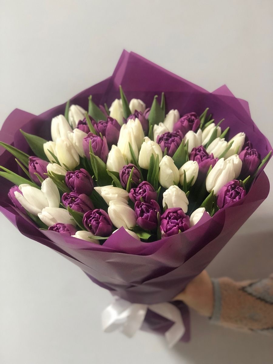 Мы можем предложить вам букет из 51 тюльпана, состоящий из белых и фиолетовых цветов. Белые тюльпаны символизируют чистоту, невинность и радость, а фиолетовые - загадочность, роскошь и элегантность. Такой букет будет отличным подарком для особенного события или просто для того, чтобы порадовать вашу любимую. Мы упакуем его красиво, чтобы он был еще более восхитителен и презентабелен.