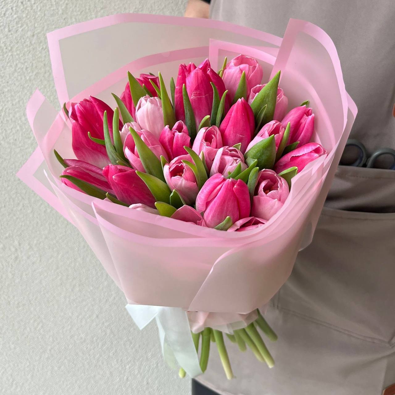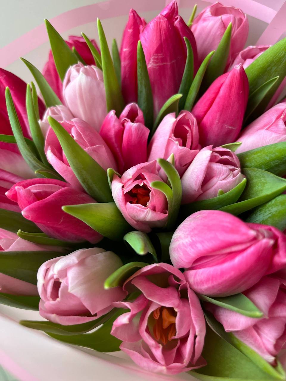 Мы внимательно следим за качеством: используем только свежие тюльпаны из теплицы и ту упаковку, которая указана на фото. Если какого‑то оттенка не будет в наличии, предложим максимально похожую замену, но всегда согласуем её с вами в чате/по телефону.